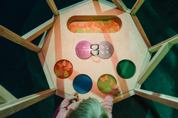 Pour commencer, la petite toundra offre un espace telle une banquise composée de couleurs et matières douces et reposantes, d’où tombent des fils blancs (renvoyant à la neige et au blizzard). Puis vient le géodome, qui propose une plongée dans les profondeurs du grand océan tel un sous-marin immergé dans l’eau. Pour finir, sous la canopée, l’enfant est invité à regarder vers le haut, vers la cime des arbres et son environnement foisonnant. Autour d’eux des centaines d’animaux animent les murs pour une immersion onirique des plus saisissantes !