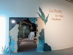Un ensemble de troncs élancés se déploie en branchage vers le plafond créant ainsi un réseau de connexions. Cette canopée stylisée, aux lignes minimales, se densifie à mesure que l’on s’enfonce dans l’espace. Sur ce plafond de branchages est déposé un velum dont les percées projettent des raies de lumières et dessinent des ombres au sol. Le visiteur explore l’exposition comme un paysage et découvre l’espace comme il le ferait d’un bois. Sur les murs, de larges fresques complètent le tableau. Elles sont elles aussi évocatrices, faites de textures et de crayonnés vivants. À l’échelle des manipulations et des explications, l’illustration se fait plus précise et didactique.